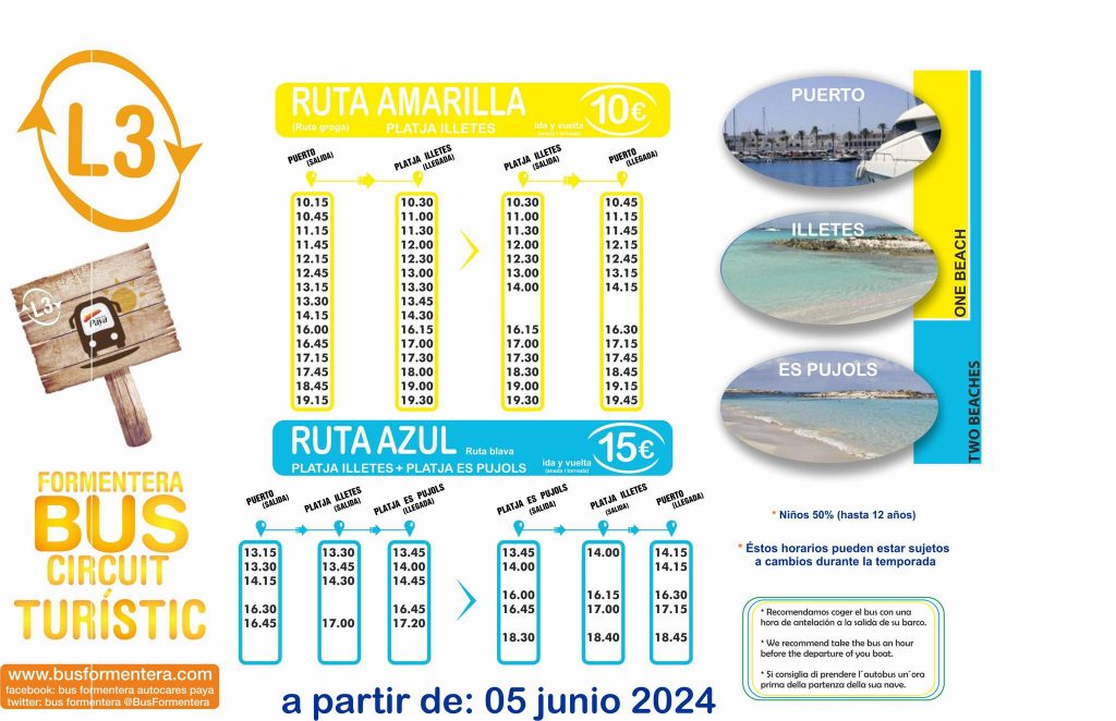 The L3 is the tourist line to go to Illetes beach from Port de La Savina. It will be available during high season, has a different price than regular lines, the yellow route goes directly to Illetes Beach. The blue route allows you to reach Illetes and Es Pujols, and the green route allows you to go down to Illetes, Es Pujols, Far de la Mola, and the viewpoint.