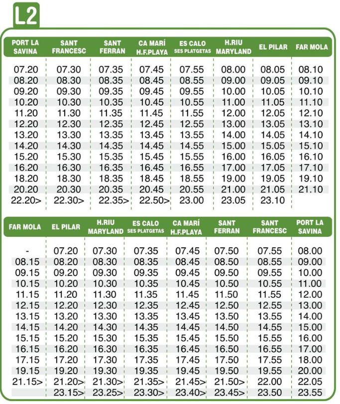 The L2 is the route that will take you from the Port to La Mola Lighthouse and stops at La Savina, Sant Francesc, Sant Ferran, Es Pujols, Es Caló, El Pilar.